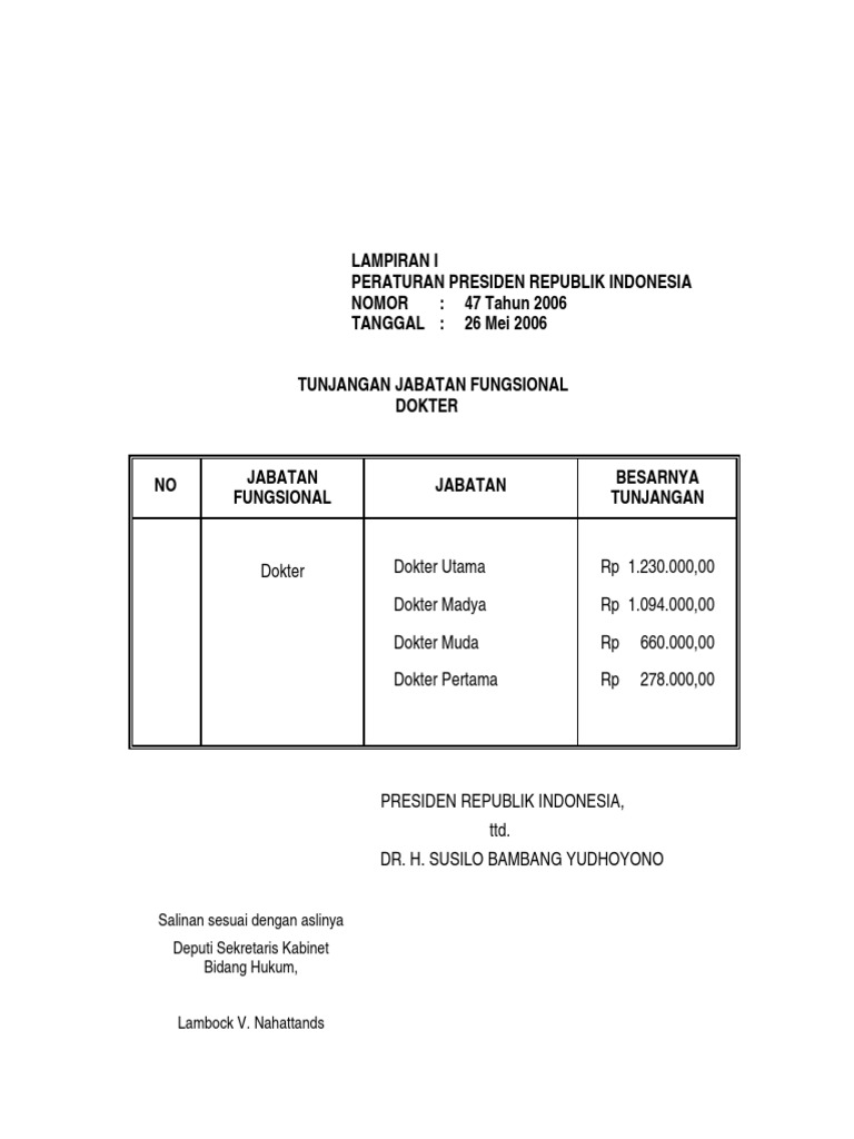 Namun saat ini masih banyak dokter yang mendapatkan gaji kurang dari Rp 3 juta per bulan khususnya dokter umum yang berada di daerah-daerah. 47 Tahun 2006 tentang Tunjangan Jabatan Fungsional Dokter Dokter Gigi Apoteker Asisten Apoteker Pranata Laboratorium Kesehatan Epidemiolog Kesehatan. Penghasilan jasa tetap basic salary yang merupakan penghasilan dasar setiap dokter yang besarannya bersifat tetap dalam kurun waktu tertentu sesuai dengan kesepakatan bersama antara dokter dan rumah sakit meliputi gaji pokok tunjangan fungsional tunjangan.